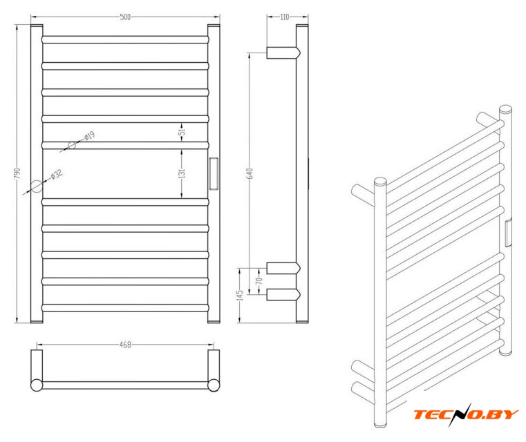 электрический, "лесенка", нержавеющая сталь, подключение боковое, таймер, терморегулятор, 79x50 см, цвет: черный