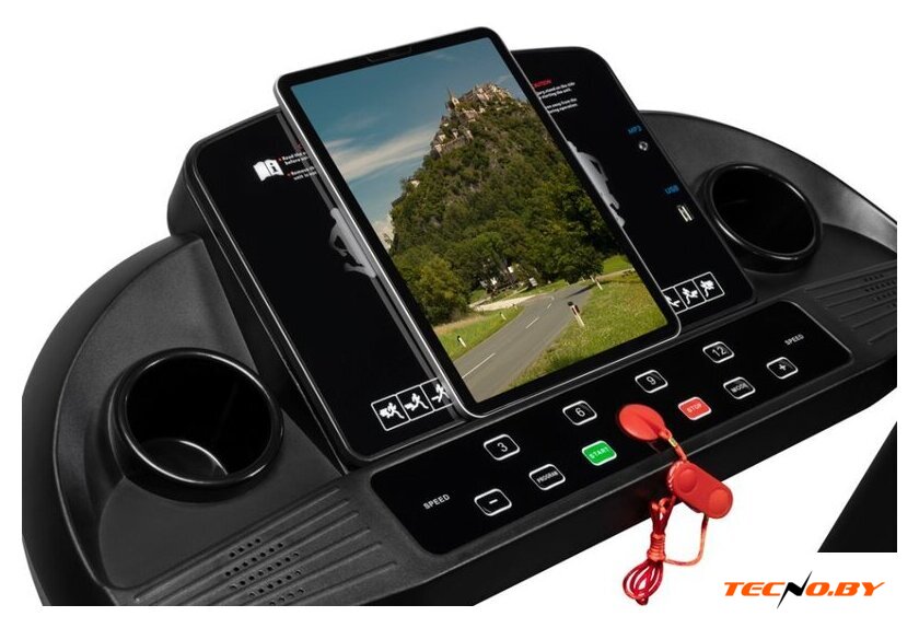 электрическая беговая дорожка, ручная ступенчатая регулировка угла наклона, полотно: 41×119 см, скорость движения: 1–16.8 км/ч, 12 программ тренировок