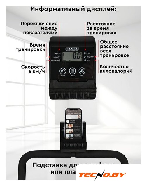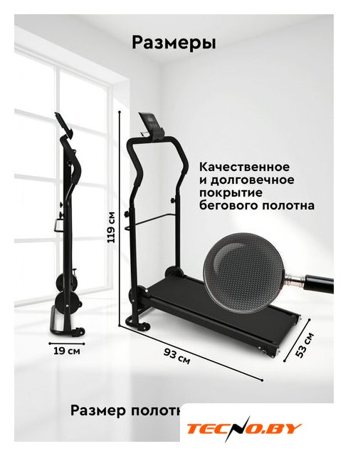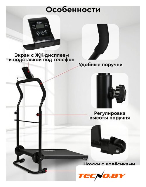 электрическая беговая дорожка, ручная ступенчатая регулировка угла наклона, полотно: 40×110 см, скорость движения: 1–12.8 км/ч, 12 программ тренировок
