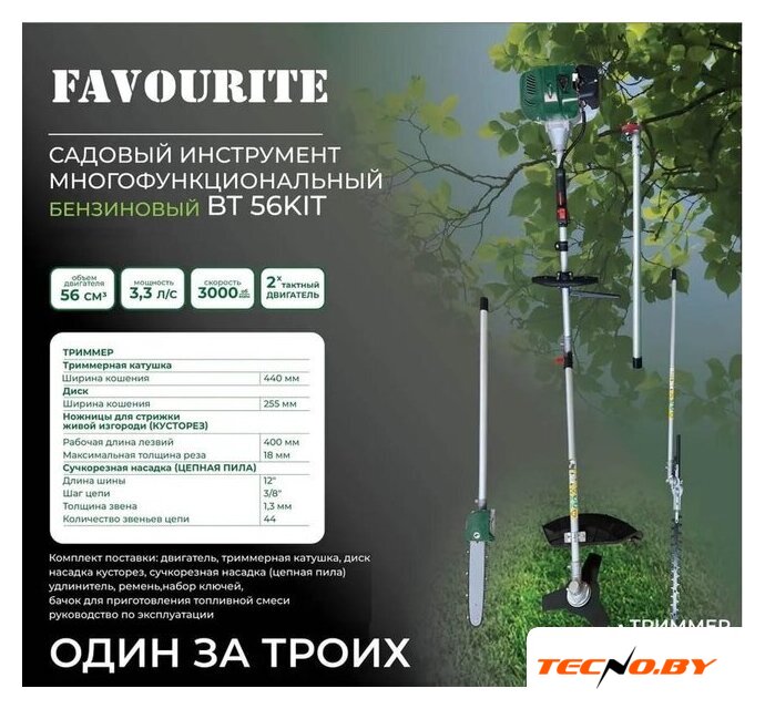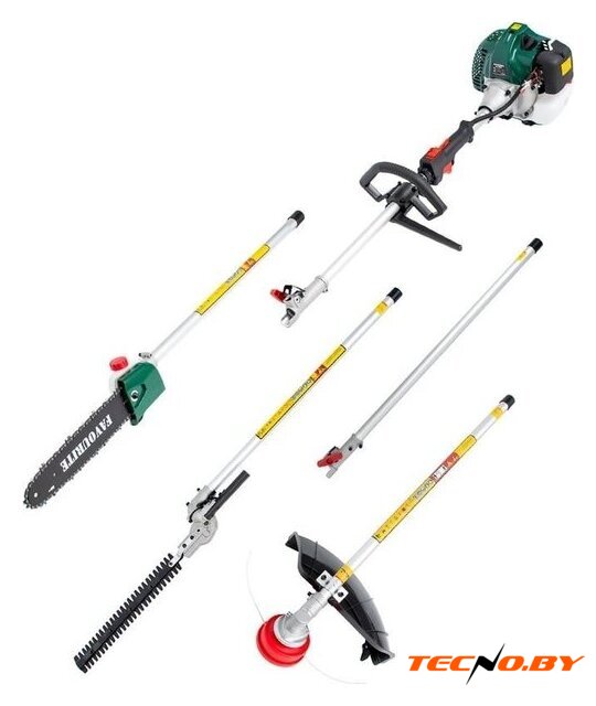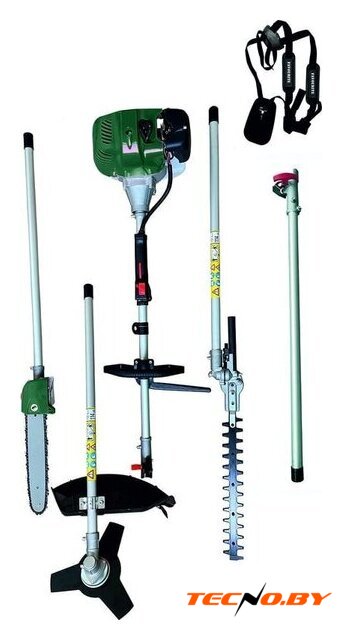 | Комплектация | - удлинитель, - защитный кожух, - диск/нож, - триммерная головка, - кусторез (насадка), - пила (насадка), - набор инструментов (ключей), - емкость для топливной смеси, - руководство по эксплуатации |