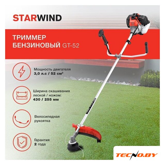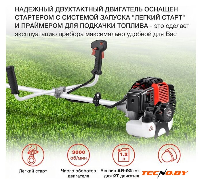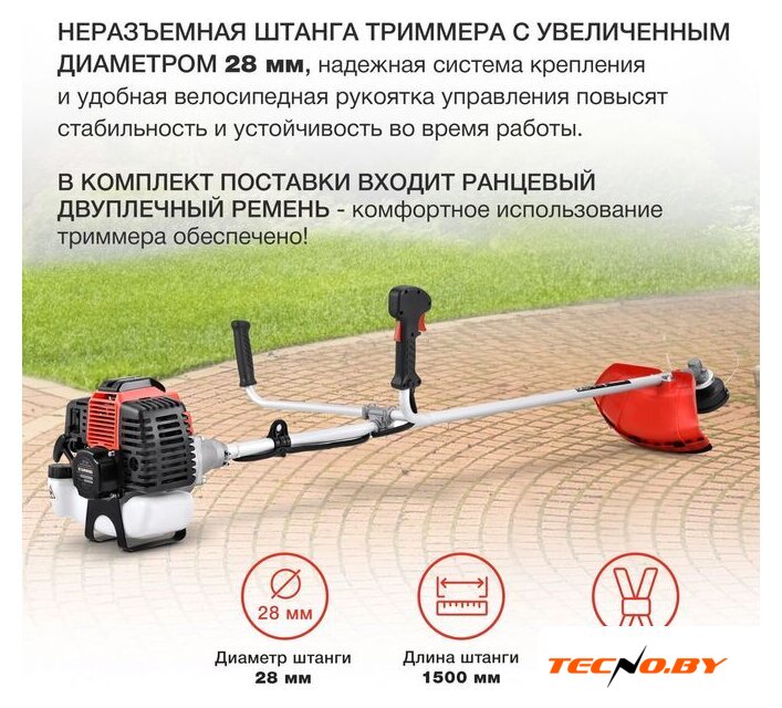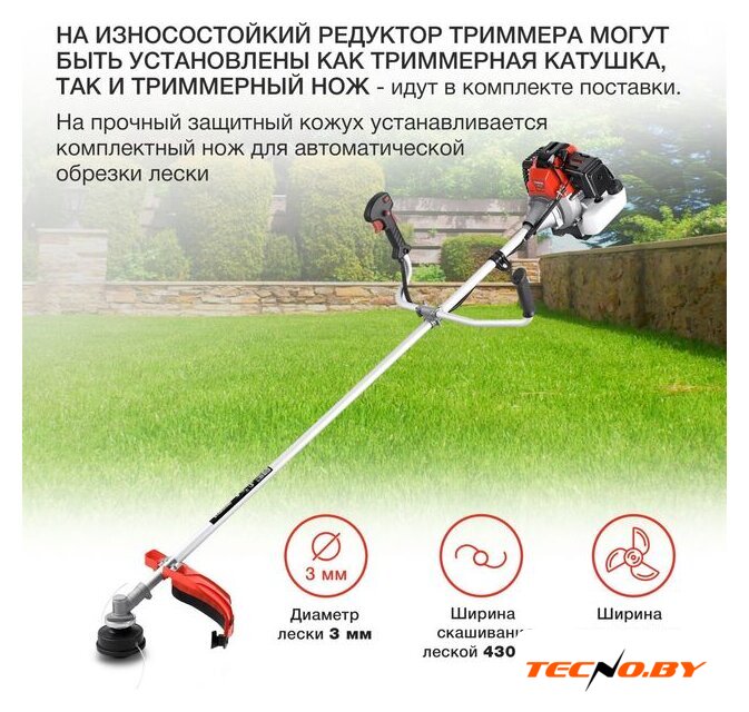 бензиновый, двухтактный, 1850 Вт, оснастка: леска+металлический нож, ширина скашивания: 25.5-43 см, легкий пуск, 6.7 кг
