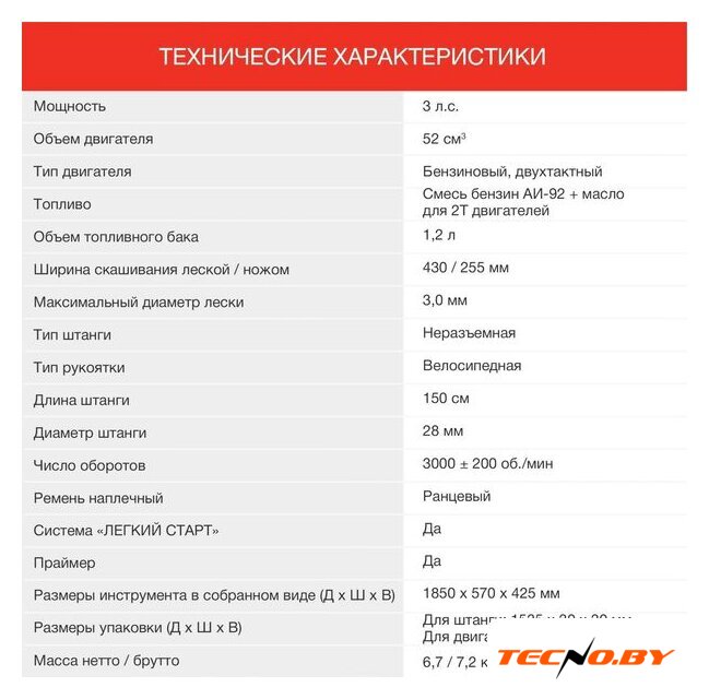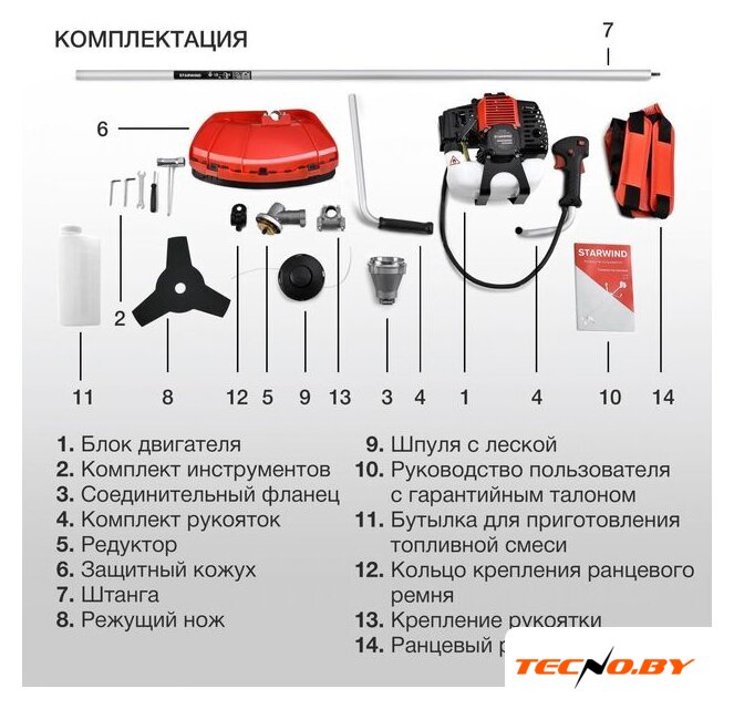 | Комплектация | - Блок двигателя, - Штанга, - Комплект крепежа,- Комплект рукояток, - Ранцевый ремень, - Защитный кожух, - Бутылка, Нож, - Шпуля с леской |