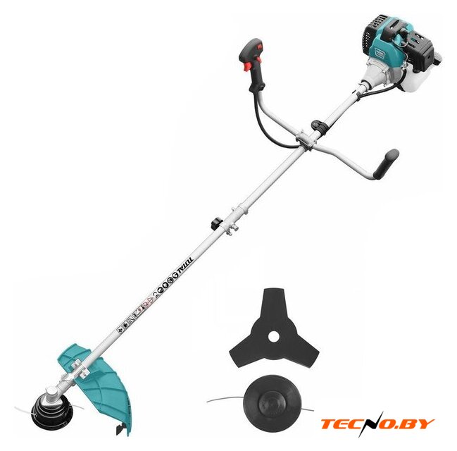 Двигатель внутреннего сгорания объемом 52 см³ обеспечивает надежную и стабильную работу устройства. Триммер оснащен топливным баком емкостью 1.2 л, что делает его экономичным и позволяет длительное время работать без необходимости в дозаправке. Расположение двигателя в верхней части конструкции способствует более удобной и легкой эксплуатации устройства.