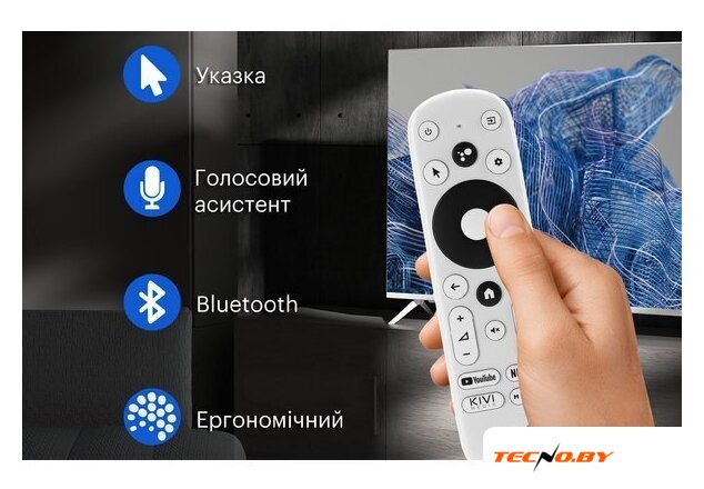 | Пульт в комплекте | KIVI RC60 – серый с голосовым управлением и кнопками Netflix, YouTube |