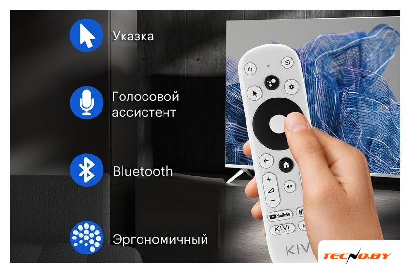 | Пульт в комплекте | KIVI RC60 – серый с голосовым управлением и кнопками Netflix, YouTube |