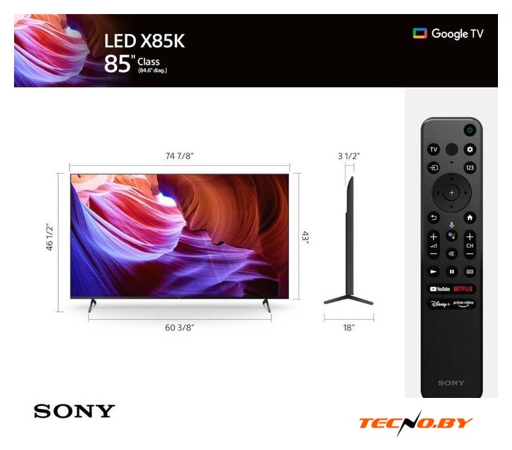 85" 3840x2160 (4K UHD), матрица VA, частота матрицы 144 Гц, Smart TV (Google TV), HDR10, HDR10+, Dolby Vision, Dolby Vision IQ, HLG, Dolby Atmos, AirPlay, Wi-Fi, смарт пульт