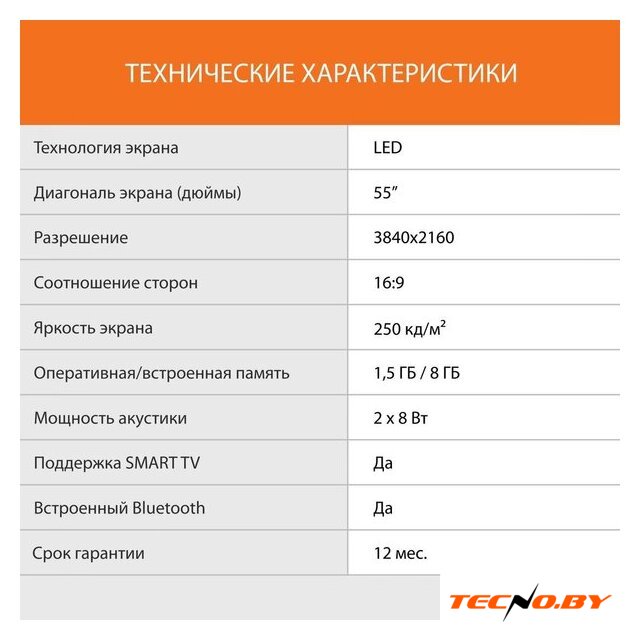 55" 3840x2160 (4K UHD), матрица VA, частота матрицы 60 Гц, Smart TV (Яндекс.ТВ), Wi-Fi, смарт пульт
