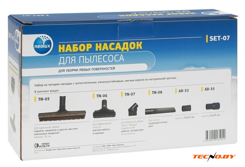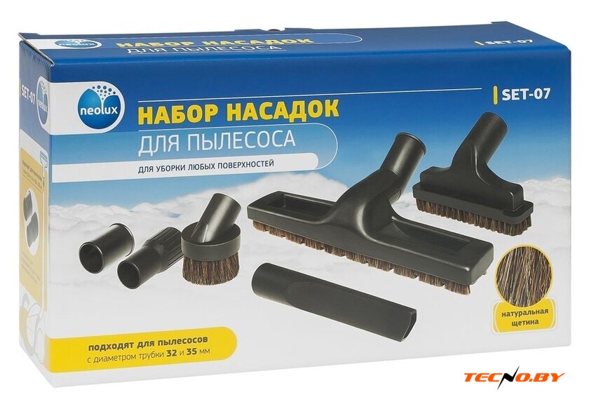 | Комплектация | TN-05 — Насадка с антистатичной, износоустойчивой, мягкой щетиной из конского волоса. Предназначена для бережной уборки паркета, ламината и других твёрдых напольных покрытийTN-06 — Насадка с антистатичной, износоустойчивой, мягкой щетиной из конского волоса. Предназначена для эффективной очистки мягкой мебели и одеждыTN-07 — Круглая насадка с антистатичной, износоустойчивой, мягкой щетиной из конского волоса. Предназначена для бережной уборки пыли с твердых поверхностей мебели, аппаратуры.TN-08 — Насадка для чистки труднодоступных местAD-32 — Переходник для пылесосов с диаметром удлинительной трубки 32 ммAD-35 — Переходник для пылесосов с диаметром удлинительной трубки 35 мм |