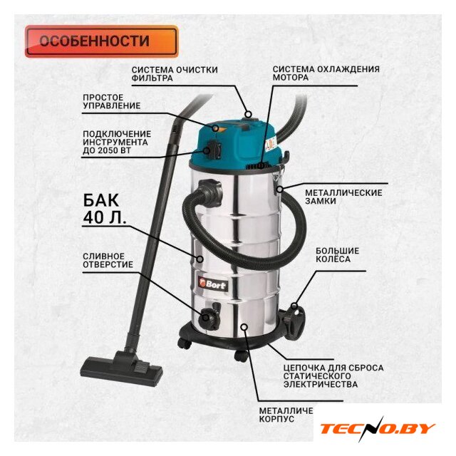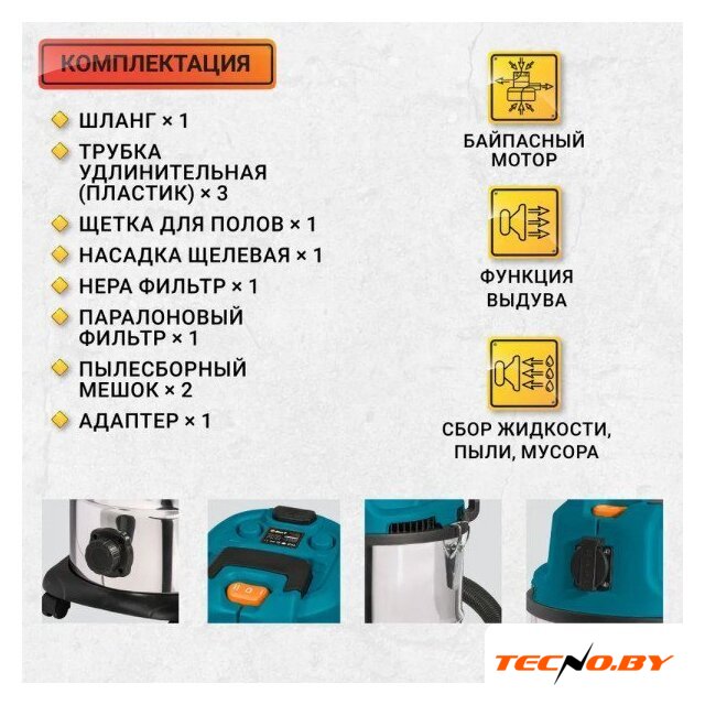 строительный, пылесборник: мешок+контейнер, потребление: 1200 Вт, регулировка мощности на корпусе