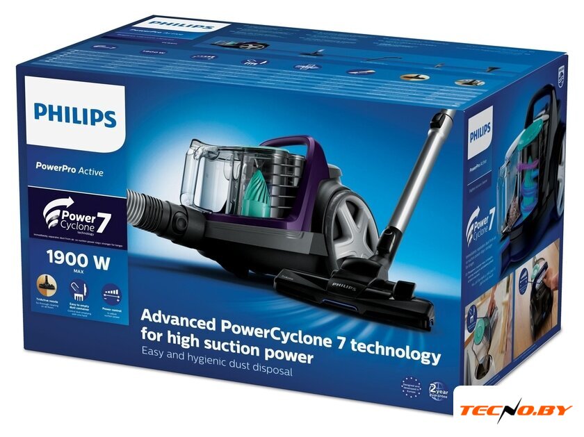 с контейнером, пылесборник: контейнер, мощность всасывания: 410 Вт, потребление: 1900 Вт, регулировка мощности на корпусе, шум 82 дБ, турбощетка
