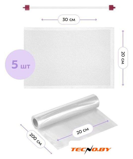 | Комплектация | 5 пакетов для вакуумирования 20 х 30 см, рулон плёнки для самостоятельного изготовления пакетов, шланг для вакуумирования в контейнерах |