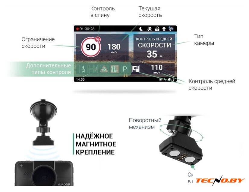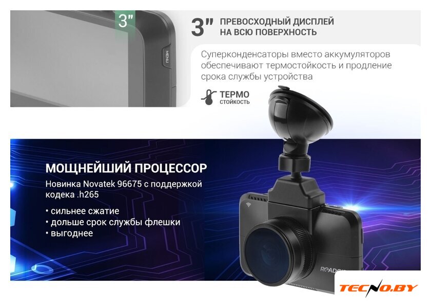 основная камера: 3.5 Мп 170°, видео 2560x1440 H.265, GPS, G-сенсор, экран 3"