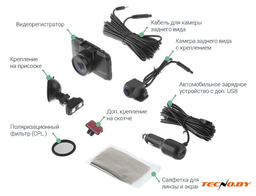 | Комплектация | - видеорегистратор;- камера заднего вида с креплением;- кабель для камеры заднего вида;- поляризационный фильтр (CPL);- крепление на присоске;- доп. крепление на 3М скотче;- автомобильное зарядное устройство;- салфетка для линзы и экрана. |