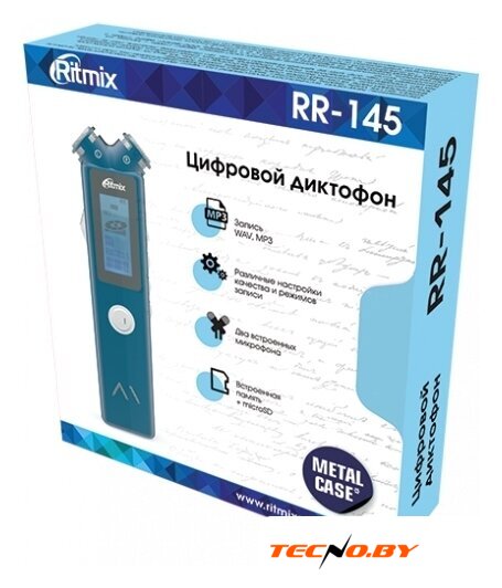микрофон стереофонический, память 16 Гб + карты microSD, сжатие MP3/WAV, питание аккумулятор, время работы до 13 часов