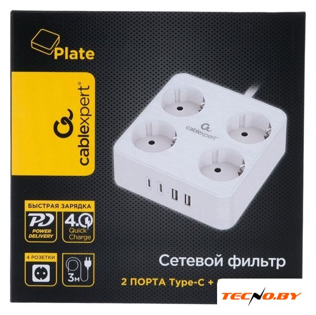сетевой фильтр, кабель 3 м, 4 розетки Schuko (евро с заземлением) / 2500 Вт/USB