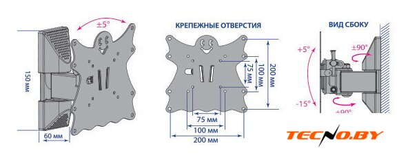 настенный кронштейн для ЖК-телевизора/для плазменного телевизора 32-55", наклон 15°, поворот 90°, цвет черный