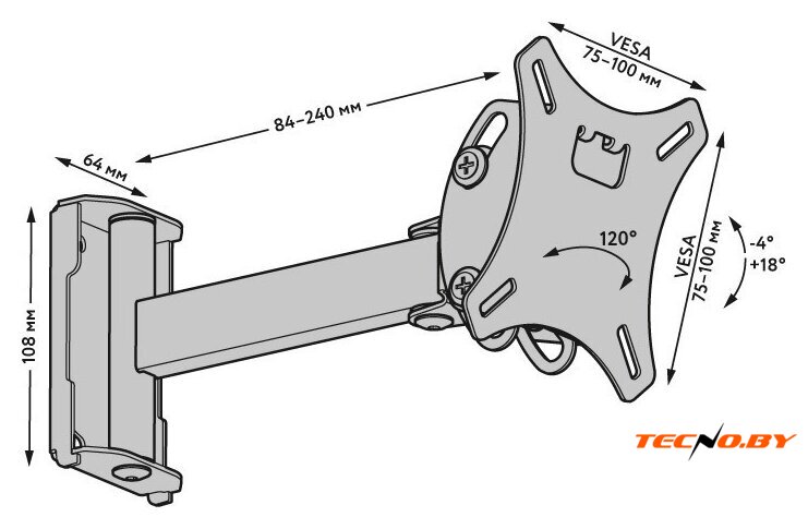 настенный кронштейн для ЖК-телевизора 14-42", наклон 15°, поворот 90°, цвет черный