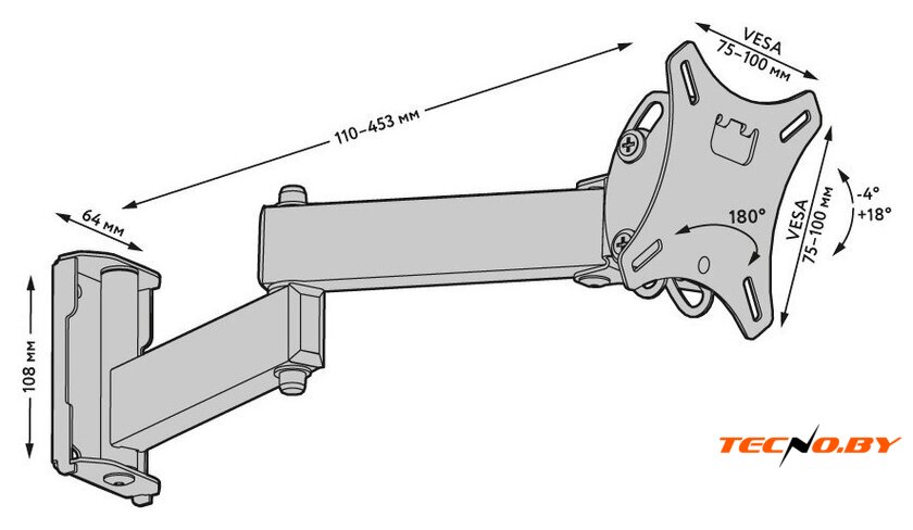 для ЖК-телевизоров, 10-26", настенный, поворотный, наклон 15°, поворот 180°, цвет черный