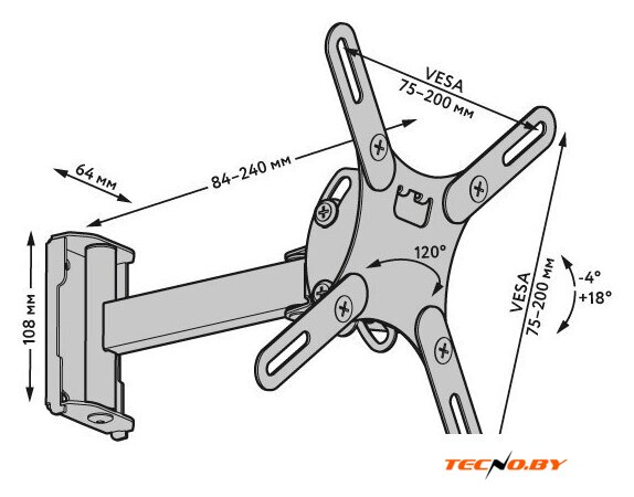 настенный кронштейн для ЖК-телевизора 15-42", наклон 12°, поворот 90°, цвет черный