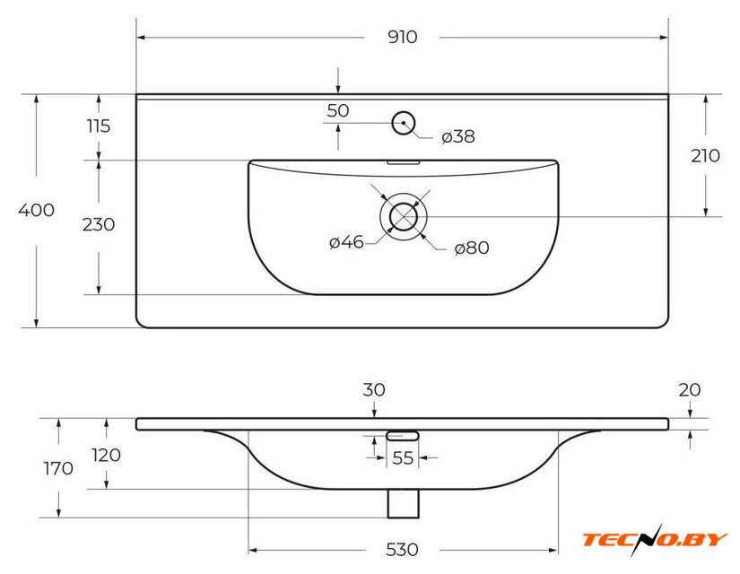 70x45.5 см, с одной чашей, врезной, санитарная керамика, крепление на мебельный шкаф/на столешницу