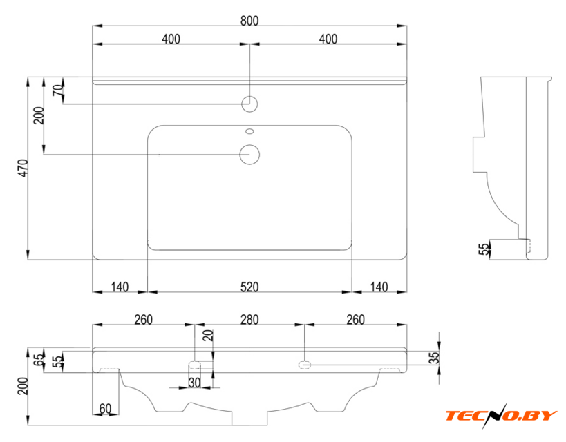 С размерами 80 см в ширину, 47 см в глубину и 20 см в высоту, умывальник предлагает идеальный баланс между компактностью и комфортом. Присутствие отверстия под смеситель упрощает установку этого важного элемента, а наличие перелива предотвращает возможные проблемы с затоплением, добавляя уверенности в ежедневное использование.