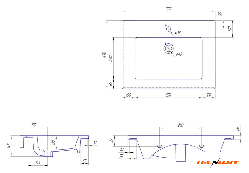 Умывальник обладает практичными габаритами: шириной 75 см, глубиной 47 см и высотой 14.5 см, что идеально подходит для малогабаритных и средних ванных комнат. В комплекте нет пьедестала или полупьедестала, а также полок, что позволяет экономить место и делает дизайн минималистичным и лаконичным.