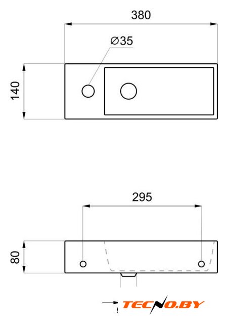 48x36 см, с одной чашей, накладной, фарфор, крепление на столешницу