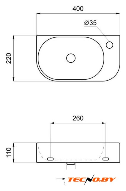 60x42 см, с одной чашей, накладной, фарфор, крепление на столешницу