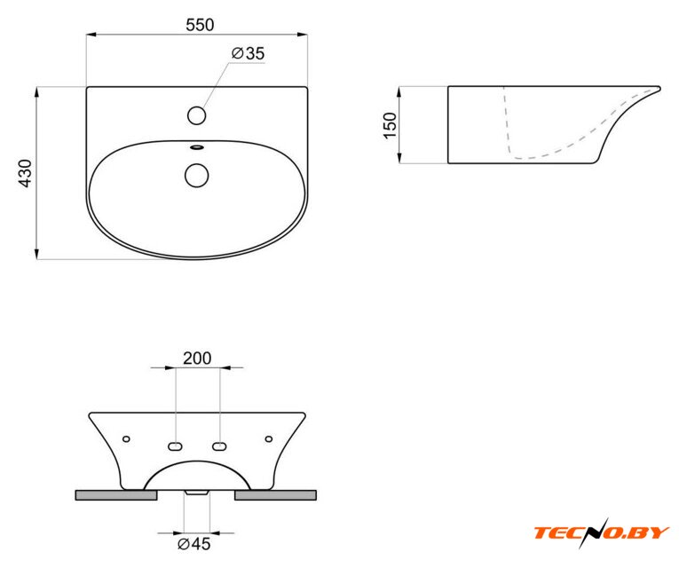 55x42 см, с одной чашей, накладной/настенный, фарфор, крепление на столешницу/на стену