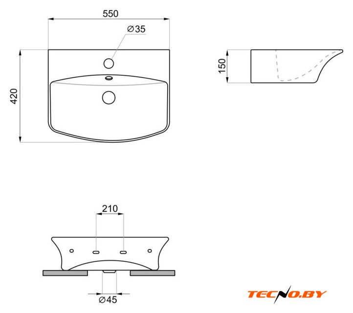 55x43 см, с одной чашей, накладной/настенный, фарфор, крепление на столешницу/на стену