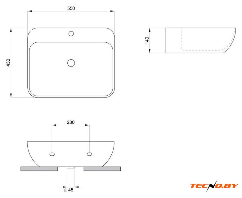 56x33 см, с одной чашей, накладной, фарфор, крепление на столешницу