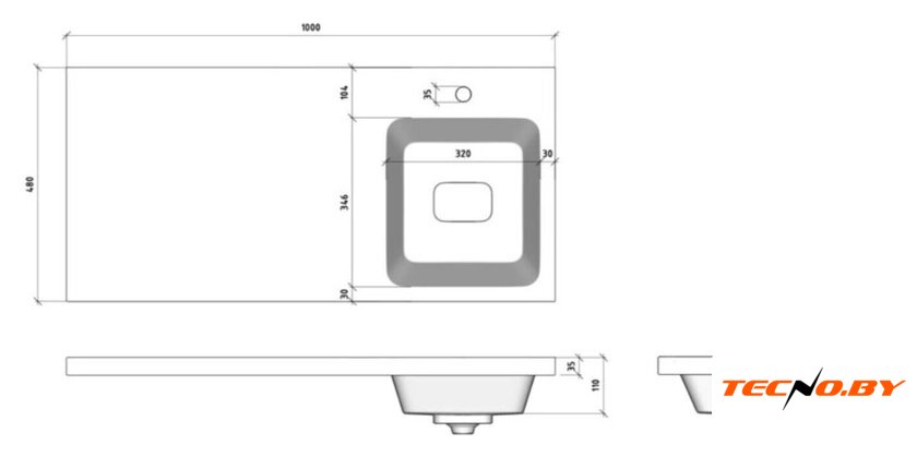 80x40 см, с одной чашей, накладной, фарфор, крепление на столешницу