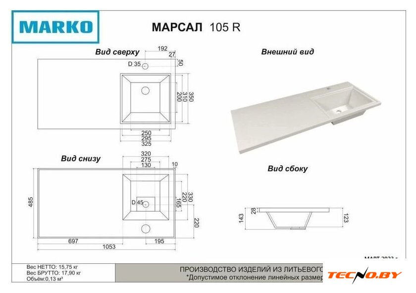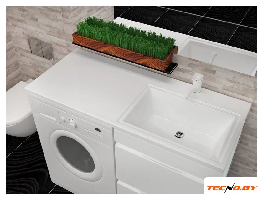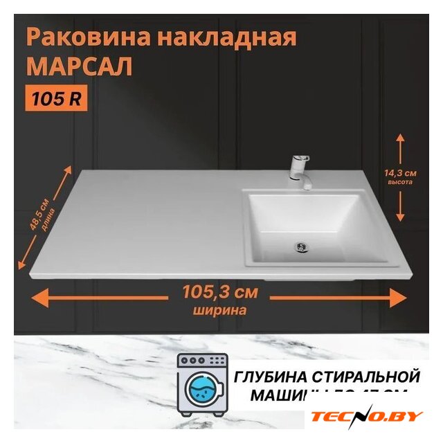 129.8x48.2 см, с одной чашей, накладной, искусственный мрамор, крепление над стиральной машиной/на мебельный шкаф