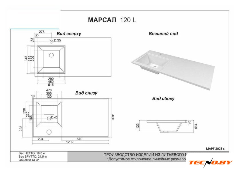 69.5x39.6 см, с одной чашей, накладной, искусственный мрамор, крепление на мебельный шкаф