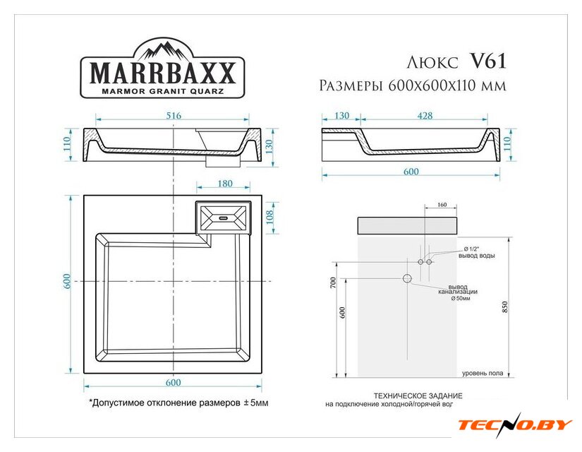 60x60 см, с одной чашей, накладной, искусственный мрамор
