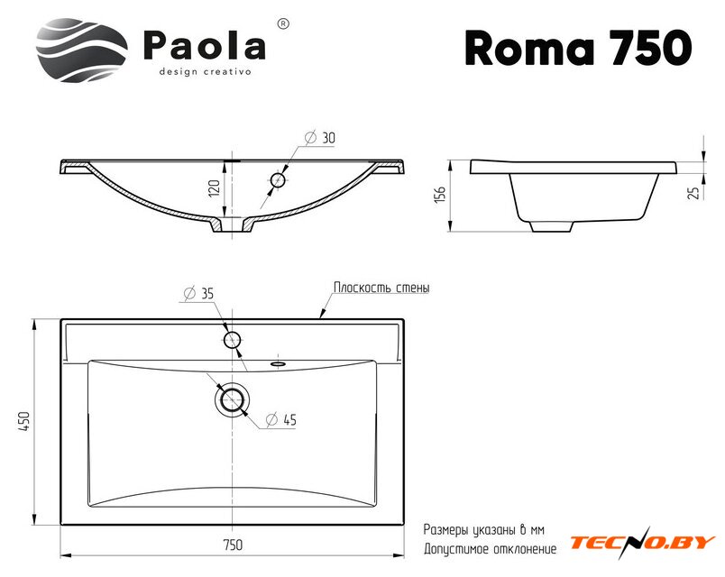 При ширине 75 см и глубине 45 см, умывальник Paola Roma 750 занимает оптимальное пространство в ванной комнате, не перегружая ее, но и предоставляя достаточно места для комфорта. Эта модель станет идеальным выбором как для компактных помещений, так и для просторных ванных.