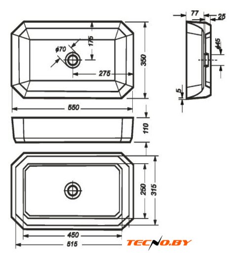 36x36 см, с одной чашей, накладной, фарфор, крепление на столешницу