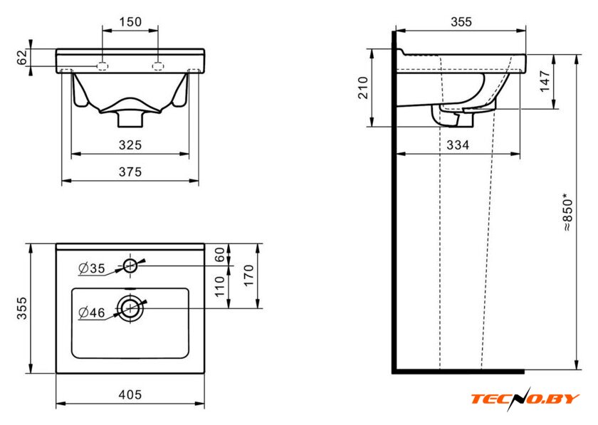 45.5x35 см, с одной чашей, настенный, санитарная керамика, крепление на пьедестал