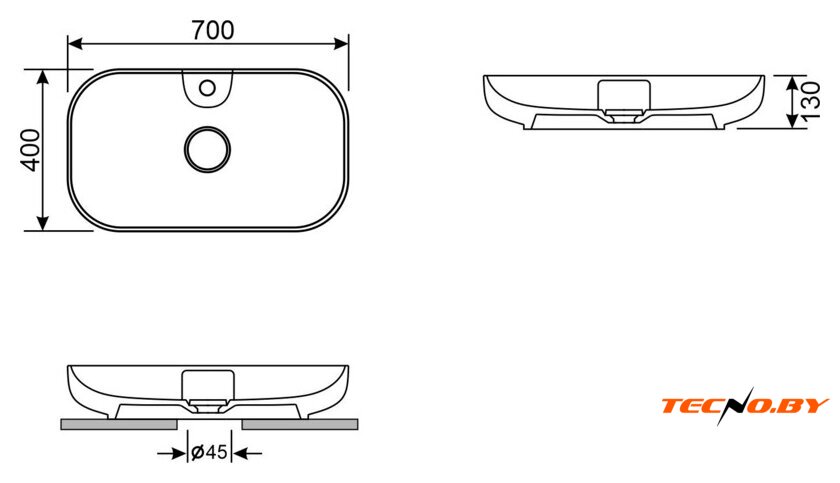 Умывальник оснащен одним отверстием под смеситель, что открывает возможности для установки различной фурнитуры на ваше усмотрение. Его ширина составляет 70 см, глубина — 40 см, а высота — 13 см, что делает его достаточно вместительным и удобным для повседневного использования. Однако отсутствие перелива требует осторожности чтобы избежать переполнения.