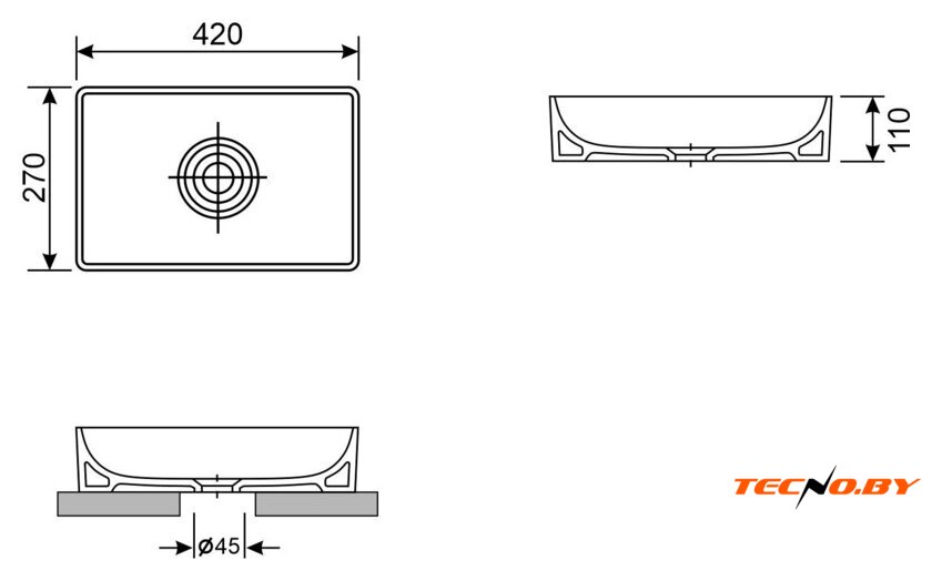 С компактными размерами 42 см в ширину, 27 см в глубину и 11 см в высоту, этот умывальник идеально подходит для размещения в небольших ванных комнатах, не занимая много места, но предоставляя достаточную вместительность для ежедневного использования.