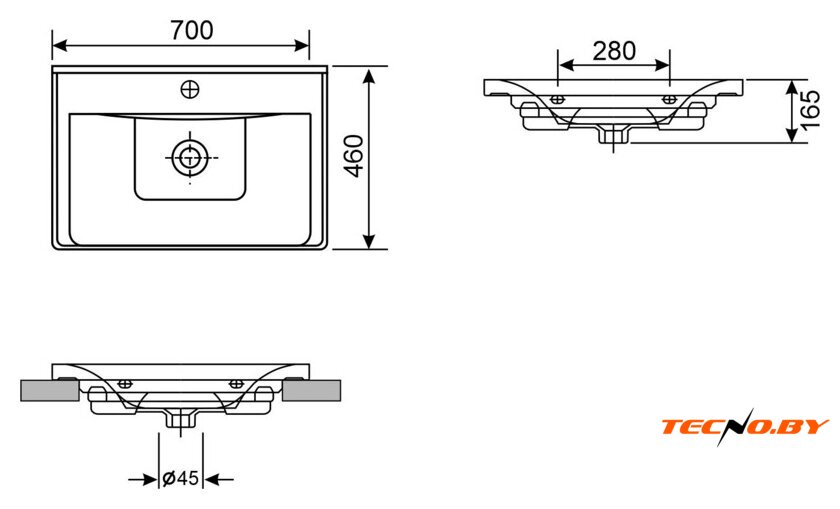 Умывальник выполнен в классическом белом цвете и имеет строгую прямоугольную форму, что придает ему элегантный и современный вид. Конструкция накладная, что позволяет установить его как на стену, так и на мебельный шкаф, обеспечивая гибкость установки в зависимости от ваших предпочтений и особенностей помещения.