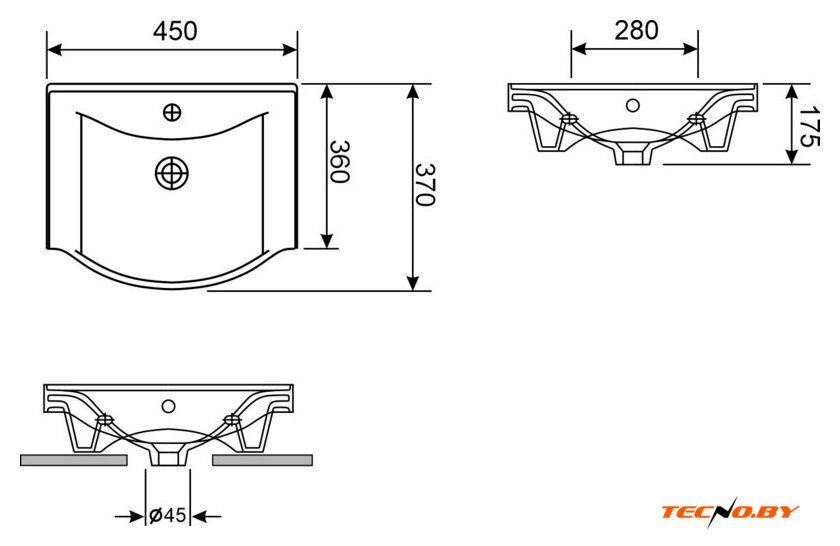Компактные размеры умывальника — ширина 45 см, глубина 37 см и высота 17.5 см — позволяют ему легко вписаться в ограниченное пространство, не жертвуя при этом функциональностью. В комплектацию входит необходимый крепеж для установки, что облегчает процесс монтажа. Наличие простого в использовании крепежа делает его идеальным выбором как для профессионалов, так и для домашних мастеров.
