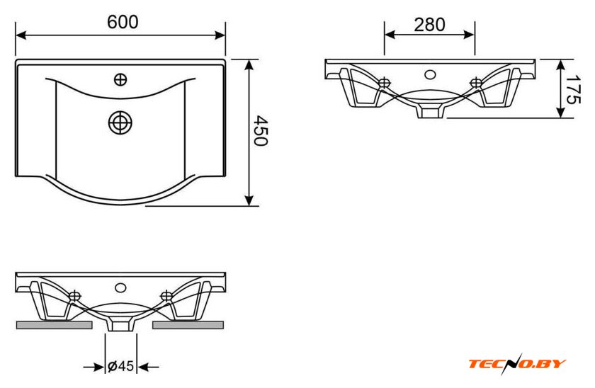 С шириной в 60 см, глубиной в 45 см и высотой 17.5 см, этот умывальник предлагает достаточно пространства для комфортного использования. 🌟 Его компактные размеры позволяют установить его даже в небольших санузлах, при этом не ущемляя простор внутреннего пространства раковины.