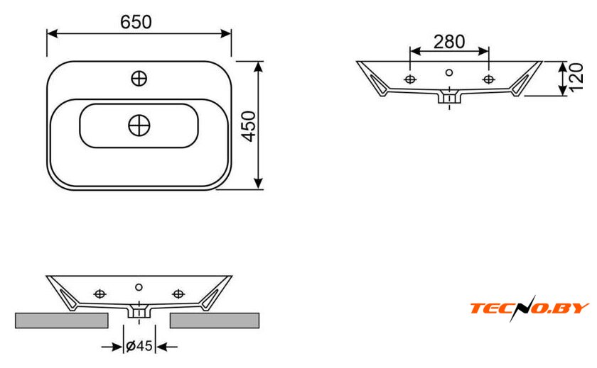 С габаритами шириной 65 см, глубиной 45 см и высотой 12 см, умывальник подходит для установки в средние и небольшие ванные комнаты. Он отличается компактностью и отсутствием дополнительных элементов, таких как кронштейны, крепеж, сливная арматура или мебельный шкаф, что упрощает его установку и интеграцию в любой интерьер.