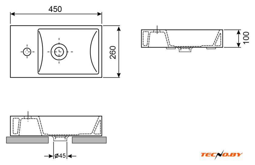 С размерами 45 см в ширину, 26 см в глубину и 10 см в высоту, этот умывальник идеально подходит для ванн различного размера, обеспечивая достаточное пространство для использования и не перегружая интерьер. Его компактные размеры делают его хорошим решением для малогабаритных ванных комнат, обеспечивая функциональность и комфорт.