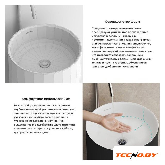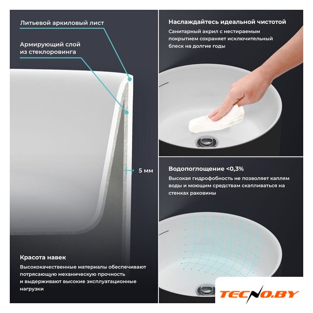 Умывальник изготовлен из высококачественного акрила, который отличается прочностью и долговечностью. Антибактериальное покрытие обеспечивает гигиеничность и защищает от появления нежелательных микроорганизмов, что делает уход за изделием легким и приятным. Перелив предотвращает случайное переливание воды, гарантируя спокойствие и чистотудо в ванной комнате.