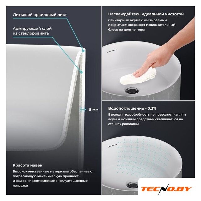Используемый акриловый материал обеспечивает высокую прочность и устойчивость к механическим повреждениям. Его антибактериальное покрытие гарантирует гигиеничность, что особенно важно для ванной комнаты, и делает умывальник легким в уходе.