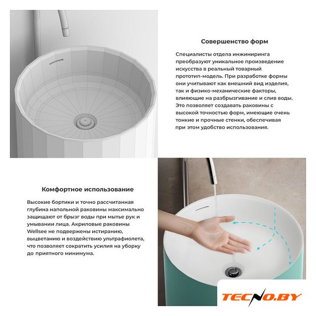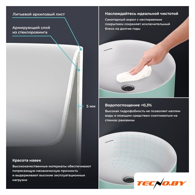 Умывальник изготовлен из качественного акрила, который отличается долговечностью и практичностью. Специальное антибактериальное покрытие защищает поверхность от бактерий и облегчает уход за изделием, сохраняя его первоначальный вид и гигиеничность в течение длительного времени. Это особенно важно в условиях повышенной влажности в ванной комнате.