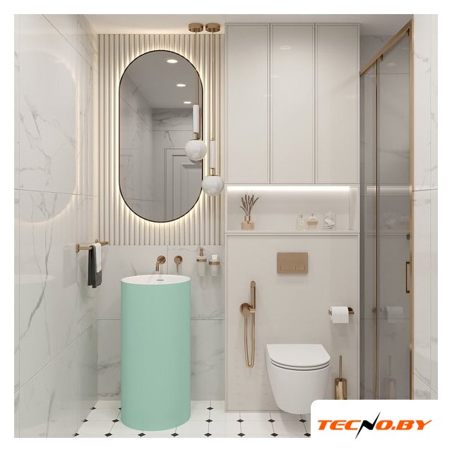 Компактные габариты умывальника (ширина и глубина 45 см, высота 85 см) позволяют легко интегрировать его даже в пространстве небольшой ванной комнаты. Напольное крепление умывальника обеспечивает легкость в монтаже и установке. Благодаря отсутствию встроенного смесителя, установка значительно упрощается и становится более гибкой.