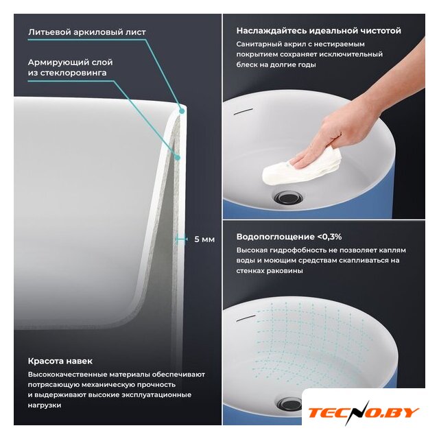 Изготовленный из акрила, умывальник обладает не только высокой прочностью, но и легкостью в уходе. Материалы, использованные при производстве, гарантируют долговечность и устойчивость к воздействию влаги. Антибактериальное покрытие добавляет дополнительный уровень гигиеничности, что особенно важно для сантехнических изделий.